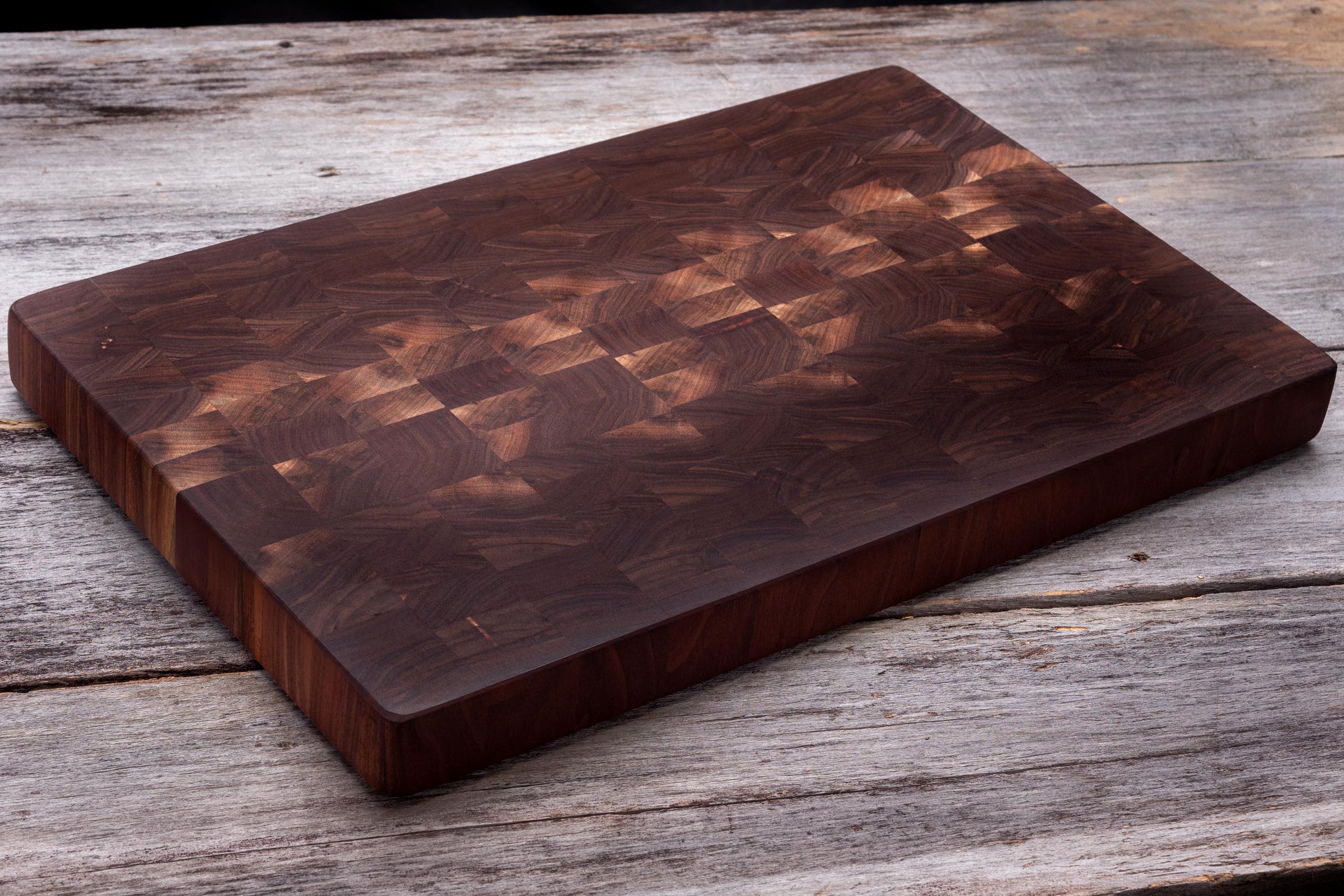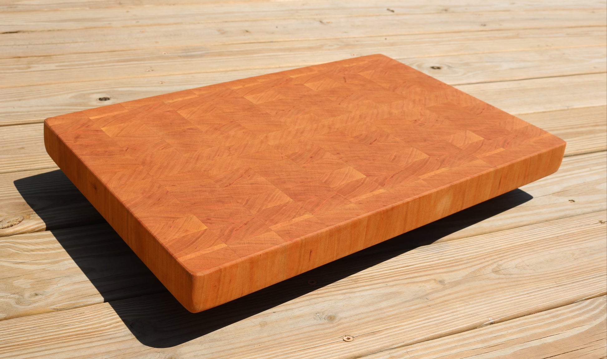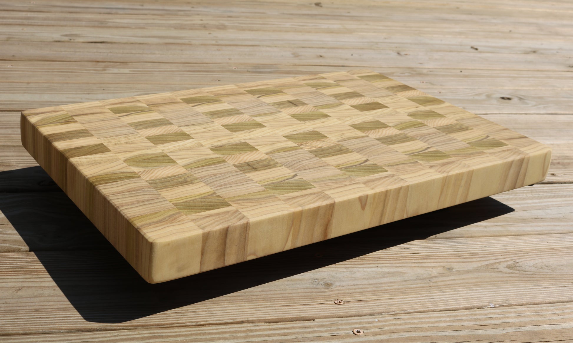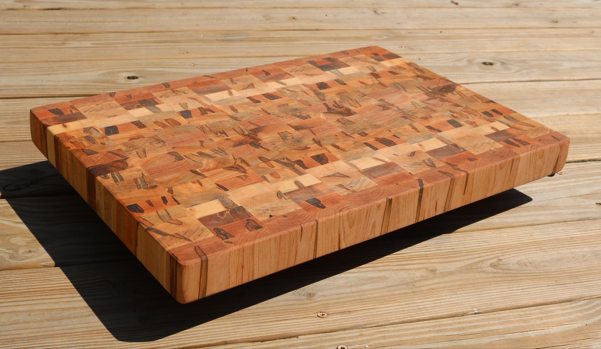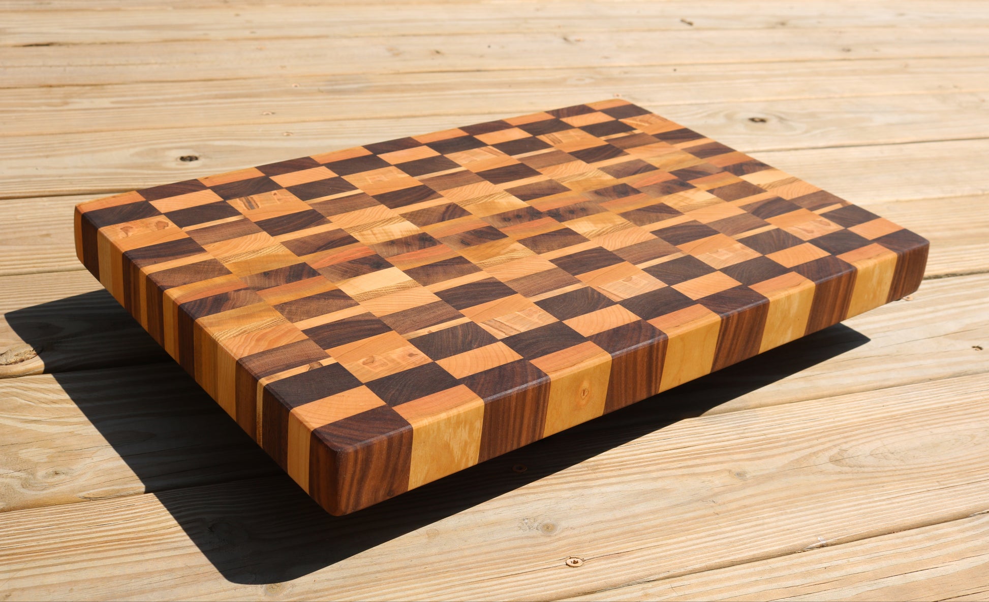 A large end grain cutting board made of black walnut, cherry, maple, ambrosia maple, white oak, tulip poplar, hickory, or a combination of these hardwoods. All quality handmade with their own unique design. No two boards are exactly alike.